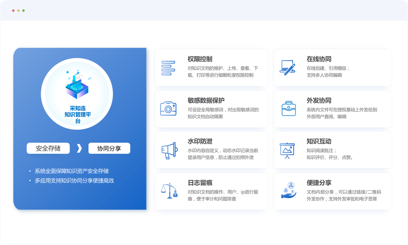 采知连提供细颗粒权限管控、敏感数据保护、知识资源分级、操作日志留痕、动态水印防摄等应用安全保障手段,同时在服务器端满足加密存储与传输的要求,全面保障组织知识资产安全;在保障安全的基础上,提供在线协同、外发协同、便捷分享、知识互动等功能促进知识分享。