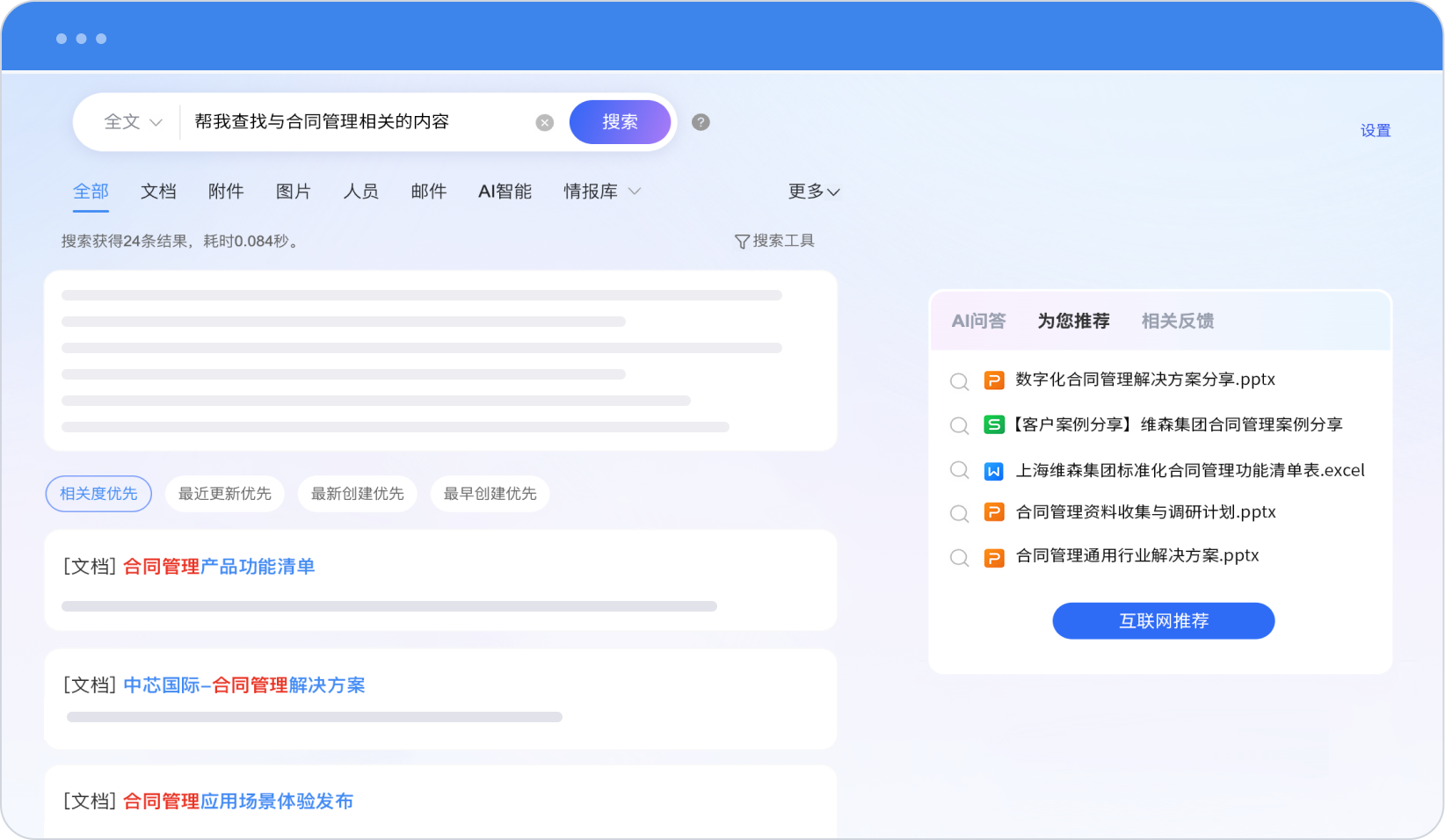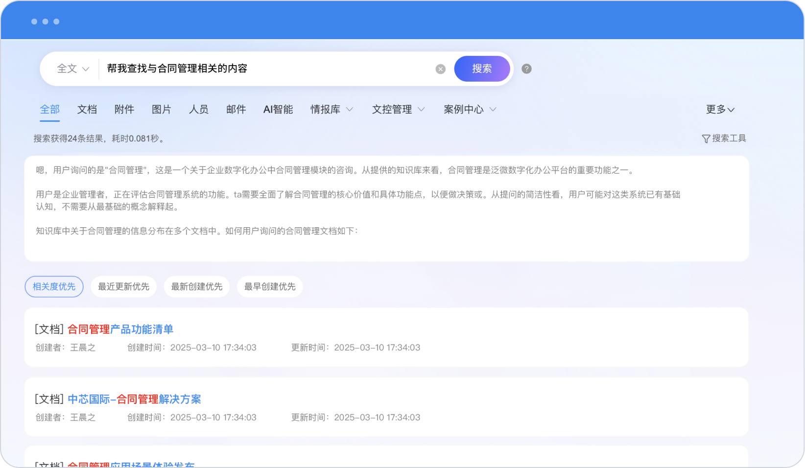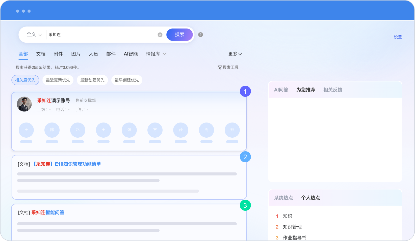 输入模糊搜索意图,自动根据岗位模型、搜索历史、问题关联业务场景等判断搜索意图,对命中结果排序,确保第一屏即可获取最佳内容。支持结果中关键词高亮、按时间作者等条件二次筛选排序。海量数据秒级反馈,并且可在搜索结果中切换排序条件。
