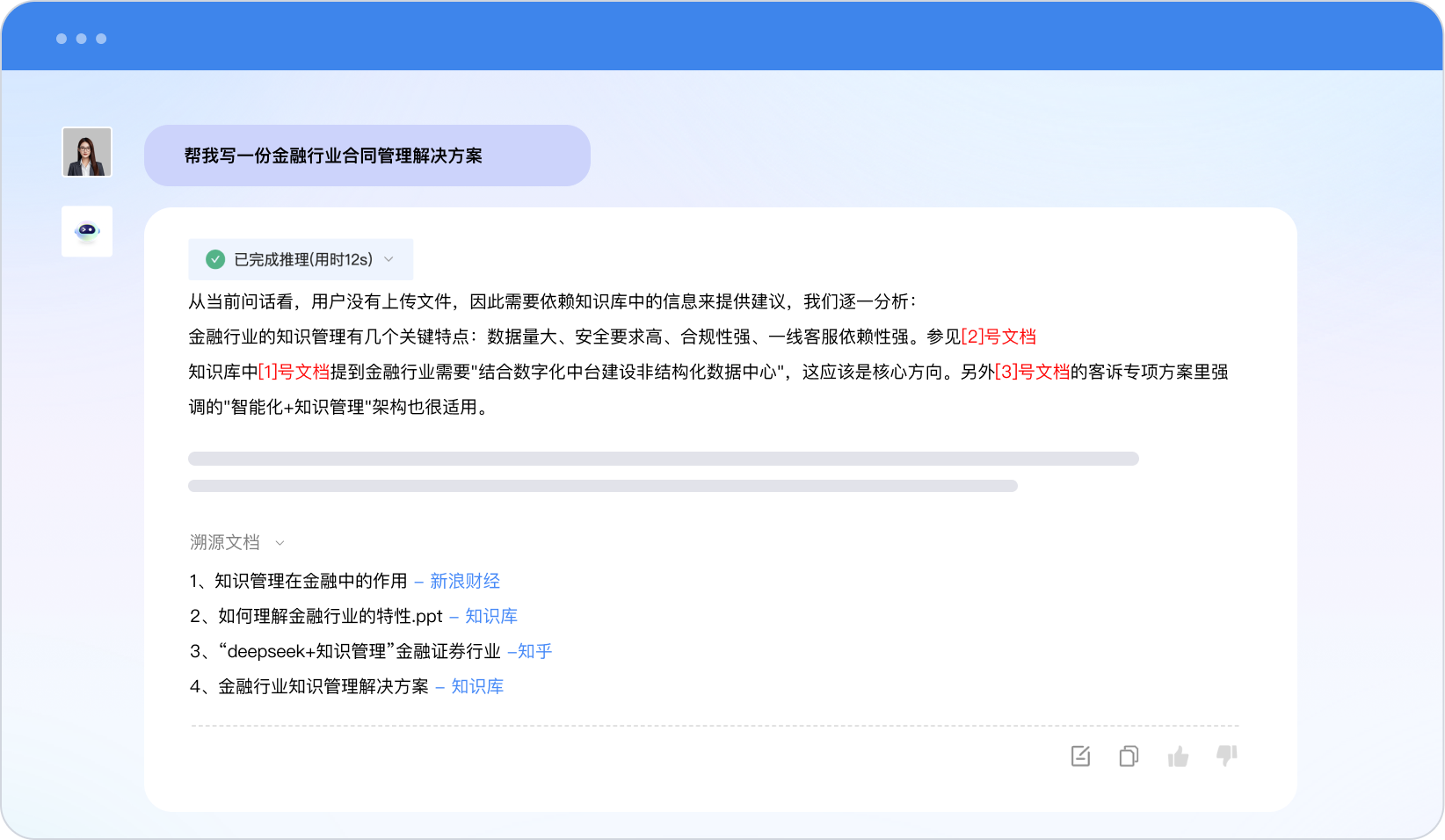 全面整合来自不同领域、不同来源的多个相关知识信息,通过AI模型进行深度推理分析,针对复杂问题,精准生成附带清晰证据链的答案。问答结果具备溯源功能,用户既可在线查阅溯源文档,也能将其下载到本地。