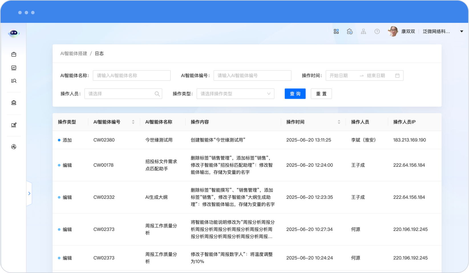 为保障信息使用合规与安全,针对知识搜索及问答操作,以及各类智能体的调用与使用情况,均开展全面且详细的记录工作。记录内容涵盖操作时间、具体行为、涉及数据等关键信息,以便后续进行审计追溯。