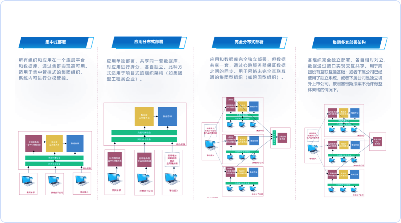 集中式部署:支持集中部署,统一运维、统一存储、统一管理; 集团化部署:支持集团架构,应用及文件存储均可做分布式存储,统一管理,独立使用; 全球化部署:支持全球化架构,符合海外审计要求,保障数据传输效率。