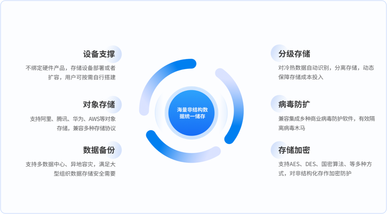 不绑定存储硬件,存储空间扩容上用户无需纠结存储厂商的品牌型号; 支持文件分布式存储,以及分区域存储,一套应用系统可以对接多地存储; 支持对象存储,支持PB级海量非结构化数据高效存储利用。