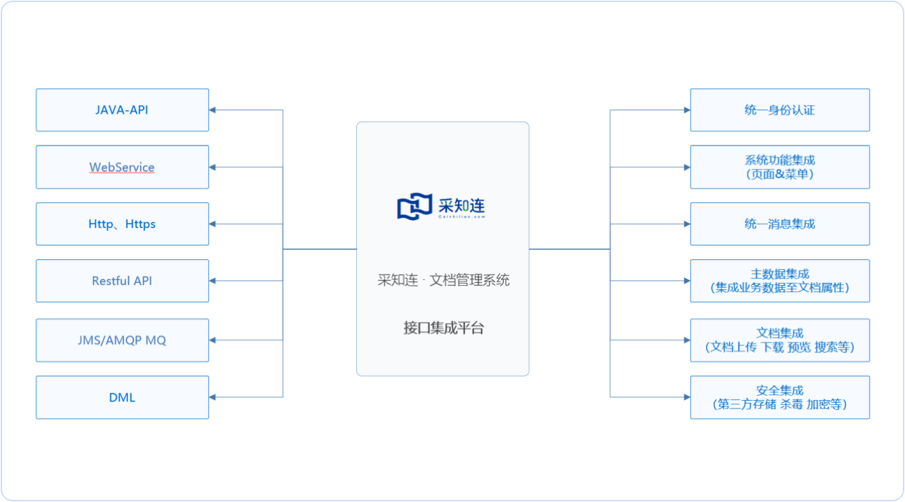 提供统一的集成服务中心,常见集成场景实现插件式管理,无需单独接口开发; 采集集成:构建统一知识文档存储中心,所有异构知识文档可实时统一归集存储; 服务集成:系统内预览、编辑、搜索等服务均支持对外发布,便于三方系统调用。