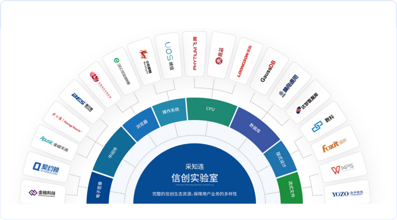 从底层CPU、服务器、中间件、数据库、浏览器到各种文档环境进行全面信创支持,打造全生态信创平台。